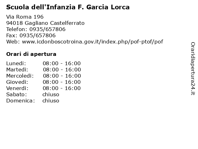 1 Istituto Comprensivo Don Bosco (Segreteria Presso Gagliano Castelferrato) (distanza: 0,00 km) Via Roma 196, 94018 Gagliano Castelferrato (segreteria, asilo, bosco, castelferrato, castelferrato), comprensivo, dirigente scolastico, don, elementari, gagliano, infanzia, istituto, istituto comprensivo, istruzione, lezioni, liceo, medie, presso, scuole, segreteria 2 Istituto Comprensivo Don Bosco (Segreteria) (distanza: 9,52 km) Via Raffaello Sanzio 21, 94018 Troina (segreteria), asilo, bosco, comprensivo, dirigente scolastico, don, elementari, infanzia, istituto, istituto comprensivo, istruzione, lezioni, liceo, medie, primaria, scuola, scuola dell'infanzia, scuola elementare, scuole, segreteria 3 Scuola dell'Infanzia Via Vittorio Emanuele (distanza: 12,68 km) Via Vittorio Emanuele 15, 94014 Nicosia asilo, dell'infanzia, dirigente scolastico, elementari, emanuele, infanzia, istituto comprensivo, istruzione, lezioni, liceo, medie, primaria, scuola, scuola dell'infanzia, scuola elementare, scuola materna, scuola media, scuole, via, vittorio 4 Scuola dell'Infanzia Largo Peculio (distanza: 13,01 km) Largo Peculio 25, 94014 Nicosia asilo, dell'infanzia, dirigente scolastico, elementari, infanzia, istituto comprensivo, istruzione, largo, lezioni, liceo, medie, peculio, primaria, scuola, scuola dell'infanzia, scuola elementare, scuola materna, scuola media, scuola paritaria, scuole 5 Scuola Primaria Carmine (distanza: 13,01 km) Largo Peculio 25, 94014 Nicosia asilo, carmine, dirigente scolastico, elementari, infanzia, istituto comprensivo, istruzione, lezioni, liceo, medie, primaria, scuola, scuola dell'infanzia, scuola elementare, scuola materna, scuola media, scuola paritaria, scuola primaria, scuola secondaria, scuole 6 Scuola dell'Infanzia San Giacomo (distanza: 13,22 km) Contrada da San Giacomo s.n.c., 94014 Nicosia asilo, dell'infanzia, dirigente scolastico, elementari, giacomo, infanzia, istituto comprensivo, istruzione, lezioni, liceo, medie, primaria, san, scuola, scuola dell'infanzia, scuola elementare, scuola materna, scuola media, scuola paritaria, scuole |