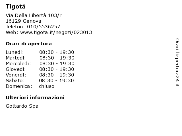 1 Tigotà (distanza: 0,00 km) Via della Libertà 103R, 16129 Genova genova, orari, orario apertura, tigota, tigota', tigotà 2 Tigotà (distanza: 0,53 km) Corso Torino 18/20/22R, 16129 Genova cosmesi, make up, negozi, profumi, tigotà 4 Tigotà (distanza: 5,06 km) Via Rolando 53, 16151 Genova genova, orari, orario apertura, tigota, tigota', tigotà 6 Tigotà (distanza: 6,47 km) Via Cornigliano 135R, 16152 Genova accesori, bagnoschiuma, bucato, casa, creme, cucina, cura, detergenza, make-up, persona, pulizia ambienti, tigota', tigotà |
