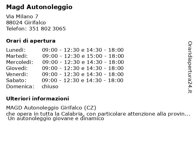 | Lunedi | 09:00-12:30 e 14:30-18:00 |