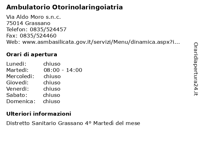 | 1 Sede Distrettuale Sanitaria (Attività specialistica Ambulatoriale : Otorinolaringoiatria) (distanza: 0,51 km) Via Aldo Moro snc, 75014 Grassano (attività, a.s.l.m., ambito, ambulatoriale, aslm, azienda sanitaria locale matera, di matera, distretto nazionale, distretto sanitario, distretto socio-sanitario, distrettuale, otorinolaringoiatria), sanitaria, sede, sistema nazionale sanitario, specialistica 2 Ospedale Rocco Mazzarone (Attività Specialistiche : Ambulatorio Otorinolaringoiatria) (distanza: 12,19 km) Viale Regina Margherita snc, 75019 Tricarico (attività, a.s.l.m., ambito, ambulatorio, aslm, azienda sanitaria locale matera, di matera, distretto nazionale, distretto sanitario, distretto socio-sanitario, mazzarone, ospedale, otorinolaringoiatria), rocco, sistema nazionale sanitario, specialistiche 3 Sede Distrettuale Sanitaria (Attività specialistica Ambulatoriale : Otorinolaringoiatria) (distanza: 20,30 km) Via di Ciò snc, 75013 Ferrandina (attività, a.s.l.m., ambito, ambulatoriale, aslm, azienda sanitaria locale matera, di matera, distretto nazionale, distretto sanitario, distretto socio-sanitario, distrettuale, otorinolaringoiatria), sanitaria, sede, sistema nazionale sanitario, specialistica 4 Sede Distrettuale Sanitaria (Attività specialistica Ambulatoriale : Otorinolaringoiatria) (distanza: 25,83 km) Via Napoli snc, 75018 Stigliano (attività, a.s.l.m., ambito, ambulatoriale, aslm, azienda sanitaria locale matera, di matera, distretto nazionale, distretto sanitario, distretto socio-sanitario, distrettuale, otorinolaringoiatria), sanitaria, sede, sistema nazionale sanitario, specialistica 5 Sede Distrettuale Sanitaria (Attività specialistica Ambulatoriale : Otorinolaringoiatria) (distanza: 34,70 km) via Cantisani snc, 75015 Pisticci (attività, a.s.l.m., ambito, ambulatoriale, aslm, azienda sanitaria locale matera, di matera, distretto nazionale, distretto sanitario, distretto socio-sanitario, distrettuale, otorinolaringoiatria), sanitaria, sede, sistema nazionale sanitario, specialistica 6 Asl Taranto - Poliambulatorio (Otorinolaringoiatria) (distanza: 39,70 km) Via Palatrasio snc, 74013 Ginosa (otorinolaringoiatria), asl, poliambulatorio, taranto |