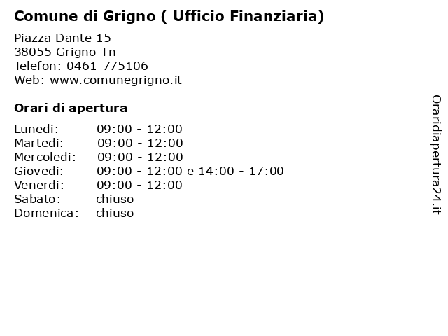 | 1 Comune di Fonzaso (Area Finanziaria) (distanza: 12,67 km) Piazza I Novembre 14, 32030 Fonzaso (BL) (area, (ufficio, area, comune, di, finanziaria, finanziaria), fonzaso, fonzaso comune, ragioneria/economato, tributi), uffici comunali fonzaso, ufficio 2 Comune di Grigno ( Segretario Comunale) (distanza: 0,00 km) Piazza Dante 15, 38055 Grigno Tn comunale), comune, di, grigno, segretario, servizi, utente 3 Comune di Grigno (Ufficio Aire ) (distanza: 0,00 km) Piazza Dante 15, 38055 Grigno Tn (ufficio, aire, comune, di, grigno, servizi, utente 4 Comune di Grigno ( Ufficio Elettorale ) (distanza: 0,00 km) Piazza Dante 15, 38055 Grigno Tn comune, di, elettorale, grigno, servizi, ufficio, utente 5 Comune di Grigno ( Ufficio Stato Civile) (distanza: 0,00 km) Piazza Dante 15, 38055 Grigno Tn civile), comune, di, grigno, servizi, stato, ufficio, utente 6 Comune di Grigno ( Ufficio Leva) (distanza: 0,00 km) Piazza Dante 15, 38055 Grigno Tn comune, di, grigno, leva), servizi, ufficio, utente |