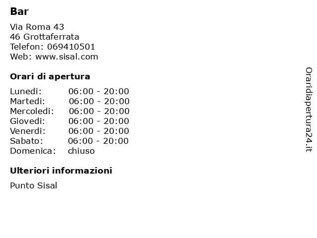 | Sabato | 06:00-20:00 |