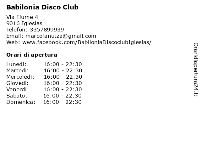 | Sabato | 16:00-22:30 |