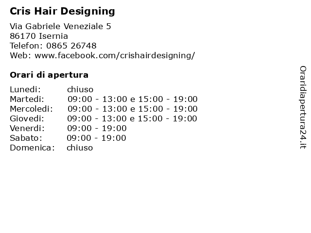 | Martedi | 09:00-13:00 e 15:00-19:00 |