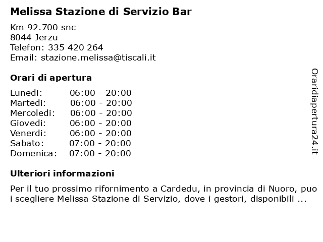 1 Melissa Snc Di Melis Anna Paola & c. Snc (distanza: 9,12 km) Localita' Pelaeddu Snc, 08044 Jerzu anna, benzina, distributori, melis, melissa, paola 2 Stazione di Servizio Melissa (distanza: 45,66 km) S.S. 125 Km 92,700 Snc, 08044 Jerzu autolavaggio, bar, carburanti, di, jerzu, melissa, ristorazione, servizio, stazione, stazionediservizio 3 Simel Innovazioni Tecnologiche Di Secci Melissa (distanza: 59,17 km) Via Zuddas 19, 09041 Dolianova innovazioni, melissa, porta, secci, simel, tecnologiche, telefoniche, vendite 4 Oil Service Srl (distanza: 0,40 km) Localita' Pelaeddu, 08044 Jerzu benzina, distributori, oil, service 5 Stazione CC Cardedu (distanza: 1,77 km) Piazza Garibaldi 1, 08040 Cardedu carabinieri, cardedu, cc, servizi al cittadino, stazione 6 Stazione di Servizio Q8 (distanza: 5,75 km) Strada Provinciale Lanusei San Paolo s.n.c, 08040 Loceri benzina, di, diesel, q8, servizio, stazione |