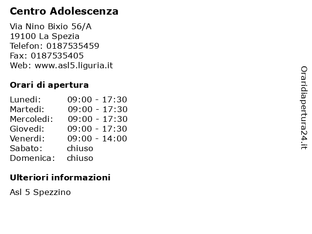 1 Usl Nord-Ovest Toscana Salute Mentale Infanzia e Adolescenza Zona lunigiana (distanza: 16,60 km) Piazza della Vittoria 22, 54011 Aulla adolescenza, centro, infanzia, lunigiana, mentale, nord, ovest, salute, salute mentale, toscana, usl, zona 2 Società della Salute della Lunigiana,Salute mentale infanzia e adolescenza (distanza: 17,15 km) Piazza Craxi 22, 54011 Aulla adolescenza, assistenza, della, infanzia, lunigiana, mentale, salute, servizi, società 3 ITL Ispettorato Territoriale del Lavoro (distanza: 1,66 km) Piazzale J. F. Kennedy 47, 19124 La Spezia adolescenza, assicurazione, attività, del, direzione, formazione, infanzia, ispettorato, itl, lavoro, liguria, ministero, orari, orientamento, politiche sociali, previdenza, servizi, territoriale, uffici territoriali, vigilanza 4 Direzione Territoriale Del Lavoro Toscana (distanza: 23,06 km) Via Don Minzoni 5, 54033 Carrara adolescenza, assicurazione, attività, del, direzione, formazione, infanzia, lavoro, ministero, orari, orientamento, politiche sociali, previdenza, servizi, territoriale, toscana, uffici territoriali, vigilanza 5 Unità Funzionale Salute Mentale Infanzia Adolescenza (distanza: 23,37 km) Piazza Sacco e Vanzetti s.n.c., 54033 Carrara adolescenza, centro, funzionale, infanzia, mentale, salute, salute mentale, toscana, unità, usl1 6 Neuropsichiatria Infanzia e Adolescenza di Borgotaro (distanza: 42,81 km) Via Benefattori 12, 43043 Borgo Val di Taro adolescenza, borgotaro, di, infantile, infanzia, neuropsichiatria |