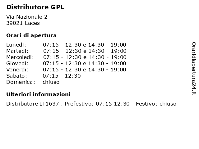 1 Distributore GPL (distanza: 0,00 km) Via Nazionale 2, 39021 Laces area, distributore, gpl, impianto, impianto gpl, sosta 2 Kostner srl distributore (distanza: 13,97 km) Via Certosa 60, 39020 Val Senales benzine, carburanti, distributore, distributori, kosner, kostner, srl 3 Distributore Metano (distanza: 18,93 km) SS38 Km 189,100 snc, 39025 Naturno area, distributore, impianto, impianto metano, metano, sosta 4 Distributore Metano (orario Carte) (distanza: 18,93 km) VIA NAZIONALE (SS38 KM 189) snc, 39025 NATURNO (orario, area, carte), distributore, impianto, impianto metano, metano, sosta 5 Distributore Metano (orario Contanti) (distanza: 18,93 km) VIA NAZIONALE (SS38 KM 189) snc, 39025 NATURNO (orario, area, contanti), distributore, impianto, impianto metano, metano, sosta 6 Distributore GPL (distanza: 31,60 km) Via Nazionale 6, 39012 Merano area, distributore, gpl, impianto, impianto gpl, sosta |