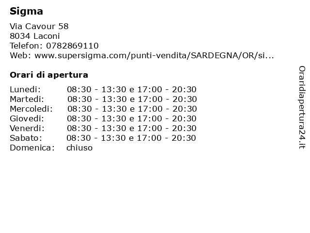 1 Sigma (orario estivo) (distanza: 0,02 km) Via Cavour 58, 08034 LACONI (orario, alimentari, estivo), macelleria, ortofrutta, sigma 2 Sigma (orario estivo) (distanza: 7,72 km) Via Roma snc, 08030 GENONI (orario, alimentari, estivo), macelleria, ortofrutta, sigma 3 Sigma (orario invernale) (distanza: 7,72 km) Via Roma snc, 08030 GENONI (orario, alimentari, invernale), macelleria, ortofrutta, sigma 4 Sigma (orario invernale) (distanza: 10,34 km) Via Roma 20, 08030 MEANA SARDO (orario, alimentari, invernale), macelleria, ortofrutta, sigma 5 Sigma (orario estivo) (distanza: 10,34 km) Via Roma 20, 08030 MEANA SARDO (orario, alimentari, estivo), macelleria, ortofrutta, sigma 6 Sigma (orario invernale) (distanza: 13,34 km) Via I Maggio 1, 08033 ISILI (orario, alimentari, invernale), macelleria, ortofrutta, sigma |