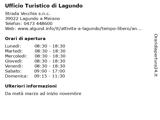 1 Ufficio Turistico di Lagundo (distanza: 0,00 km) Strada Vecchia s.n.c., 39022 Lagundo a Merano di, lagundo, turismo, turistico, ufficio, viaggi 2 Ufficio informazioni turistiche (Orario Estivo ed Invernale) (distanza: 44,06 km) Piazza Serra 10, 38025 Dimaro (orario, (stagione, ed, ente turistico, estiva), estivo, informazioni, invernale), turistiche, ufficio, ufficio informazioni 3 Ufficio informazioni turistiche (Orario Bassa Stagione) (distanza: 44,06 km) Piazza Serra 10, 38025 Dimaro (bassa, (orario, bassa, ente turistico, informazioni, stagione), turistiche, ufficio, ufficio informazioni 4 Ufficio informazioni turistiche (Orario Estivo ed Invernale) (distanza: 46,72 km) Piazzale Folgarida 3, 38025 Folgarida (orario, (stagione, ed, ente turistico, estiva), estivo, informazioni, invernale), turistiche, ufficio, ufficio informazioni 5 Consorzio turistico Pejo 3000 (distanza: 49,51 km) Piazza Municipio 5, 38024 Cogolo di Pejo 3000, consorzio, ente turistico, pejo, turistico, ufficio informazioni 6 Ufficio turistico (Dal 15 giugno) (distanza: 54,19 km) Piaz G. Marconi 5, 38032 Canazei (dal, 15, canazei, di, fassa, giugno), turistico, ufficio, ufficio informazioni, ufficio turistico, val |