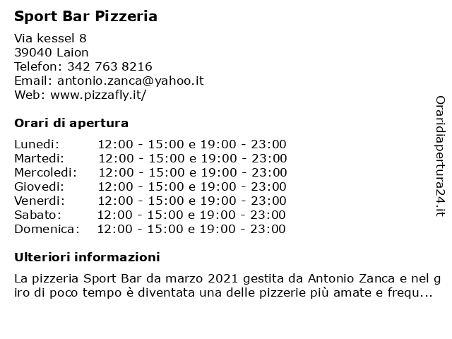 | Lunedi | 12:00-15:00 e 19:00-23:00 |