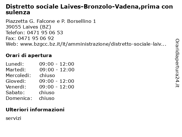 1 Distretto sanitario Laives - Bronzolo - Vadena (Servizio amministrativo) (distanza: 0,00 km) Piazzietta G.Falcone e P.Borsellino 1, 39055 Laives (servizio, amministrativo), bronzolo, distretto, informazione, laives, sanitario, servizi, vadena 2 Distretto sanitario Laives - Bronzolo - Vadena (Ambulatorio infermieristico) (distanza: 0,00 km) Piazzetta G.Falcone e P.Borsellino 1, 39055 Laives (ambulatorio, bronzolo, distretto, infermieristico), informazione, laives, sanitario, servizi, vadena 3 Distretto sanitario Laives - Bronzolo - Vadena (Consultorio materno-infantile) (distanza: 0,00 km) Piazzetta G.Falcone e P.Borsellino 1, 39055 Laives (consultorio, bronzolo, distretto, infantile), informazione, laives, materno, sanitario, servizi, vadena 4 Distretto sanitario Laives - Bronzolo - Vadena (Consultorio ostetrico) (distanza: 0,00 km) Piazzetta G.Falcone e P.Borsellino 1, 39055 Laives (consultorio, bronzolo, distretto, informazione, laives, ostetrico), sanitario, servizi, vadena 5 Distretto Sociale Laives Bronzolo Vadena - Segreteria (distanza: 0,00 km) Piazzetta G. Falcone e P. Borsellino 1, 39055 Laives (BZ) ambulatorio, assistenza, bronzolo, cure mediche, distretto, laives, sanità, segreteria, servizi ai cittadini, sociale, vadena 6 Distretto Sociale Laives Bronzolo Vadena - Prima Consulenza (distanza: 0,00 km) Piazzetta G. Falcone e P. Borsellino 1, 39055 Laives (BZ) ambulatorio, assistenza, bronzolo, consulenza, cure mediche, distretto, laives, prima, sanità, servizi ai cittadini, sociale, vadena |