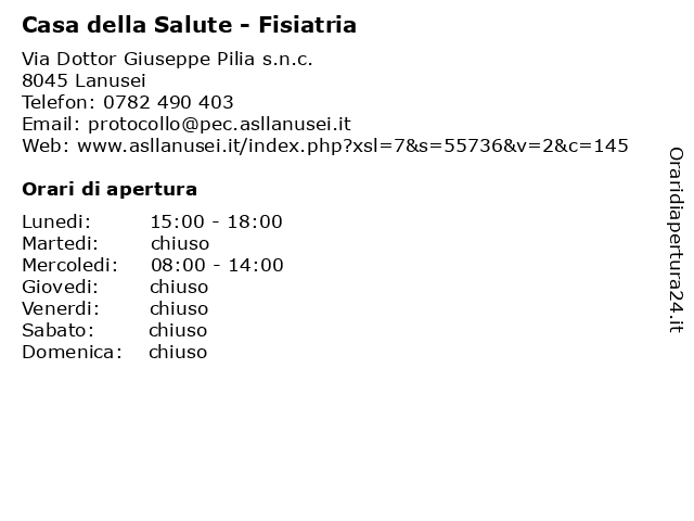 1 Casa della Salute - Medico di Medicina Generale (distanza: 0,00 km) Via Dottor Giuseppe Pilia s.n.c., 08045 Lanusei ambulatorio, assistenza, casa, cure mediche, della, di, generale, medicina, medico, salute, sanità, servizi ai cittadini 2 Casa della Salute - Urologia Dott. Valeria Tallis (distanza: 0,00 km) Via Dottor Giuseppe Pilia s.n.c., 08045 Lanusei ambulatorio, assistenza, casa, cure mediche, della, dott., salute, sanità, servizi ai cittadini, tallis, urologia, valeria 3 Csm - Centro Salute Mentale di Lanusei (distanza: 0,67 km) c/o Poliambulatorio viale don Bosco snc, 08045 Lanusei asl, assistenza ambulatoriale, assistenza infermieristica, centro, centro salute mentale, csm, day hospital, di, disturbi mentali, lanusei, mentale, psichiatra, psicologo, salute, specialisti 4 Asl 4 di Lanusei Csm - Centro Salute Mentale di Jerzu (distanza: 9,68 km) c/o Poliambulatorio via Melis 1, 08044 Jerzu asl, assistenza ambulatoriale, assistenza infermieristica, centro, centro salute mentale, csm, day hospital, di, disturbi mentali, jerzu, lanusei, mentale, psichiatra, psicologo, salute, specialisti 5 Csm - Centro Salute Mentale di Tortolì (distanza: 10,61 km) via Monsignor Carchero snc, 08048 Tortolì asl, assistenza ambulatoriale, assistenza infermieristica, centro, centro salute mentale, csm, day hospital, di, disturbi mentali, mentale, psichiatra, psicologo, salute, specialisti, tortolì 6 Centro di neuropsichiatria infantile di Tortolì (c/o Centro di Salute Mentale) (distanza: 10,61 km) Monsignor Carchero snc, 08048 Tortoli (OG) (c/o, centro, di, infantile, mentale), neuropsichiatria, ospedaliero, salute, servizio, tortolì |