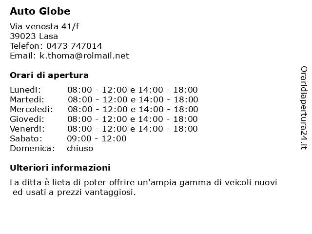 | Lunedi | 08:00-12:00 e 14:00-18:00 |