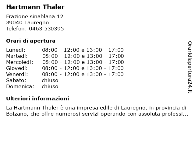 | Lunedi | 08:00-12:00 e 13:00-17:00 |