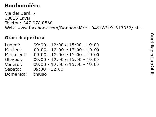 | Lunedi | 09:00-12:00 e 15:00-19:00 |