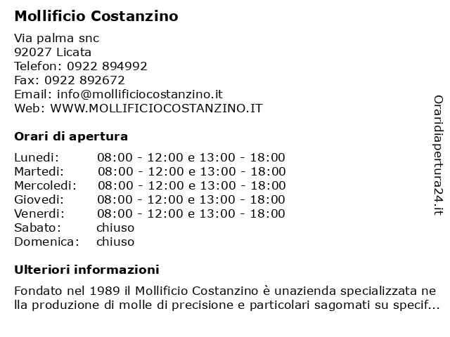 | Lunedi | 08:00-12:00 e 13:00-18:00 |