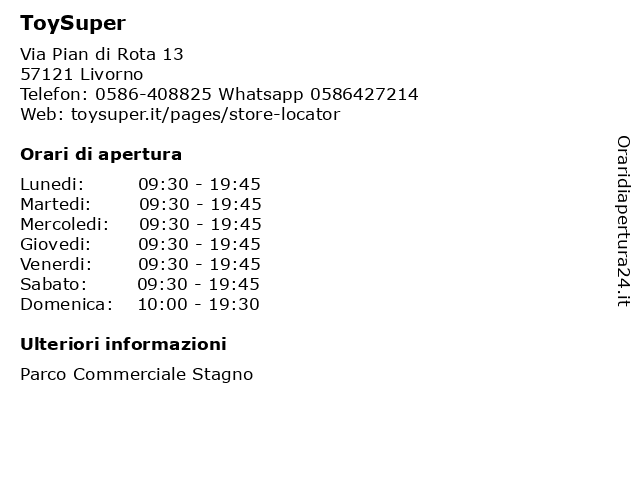 1 Toys Center (distanza: 0,15 km) Via Provinciale Pisana 635, 57121 Livorno center, giocattoli, livorno, toys, toys center 2 ToySuper (distanza: 4,08 km) Via Ricasoli 52, 57125 Livorno bimbi, center, costruzioni, giocattoli con luci, giocattoli in legno, giochi, giochi a incastro, giochi creativi, giochi per neonati, giochidi società, girelli, macchinine, massaggiagengive, peluches, prime macchine, sonagli, tappeti attività, toys, toysuper, tricicli 3 ToySuper (distanza: 14,06 km) Via Malpighi 20, 56121 Pisa center, giocattoli, pisa, toys, toys center, toysuper 4 Diamond Nail Center (distanza: 3,50 km) Corso amedeo 245/247, 57125 Livorno center, corsi per onicotecnica, diamond, nail, ricostruzione unghie 5 Maxi Toys (distanza: 3,92 km) Via G. Gelati 10, 57100 Livorno (LI) acquisti, convenienza, maxi, negozi, shopping, spesa, toys 6 Centro Toys Srl (distanza: 4,01 km) Piazza Elia Benamozegh 17, 57123 Livorno centro, comm, dett, giocattoli, hobbistica, toys |
