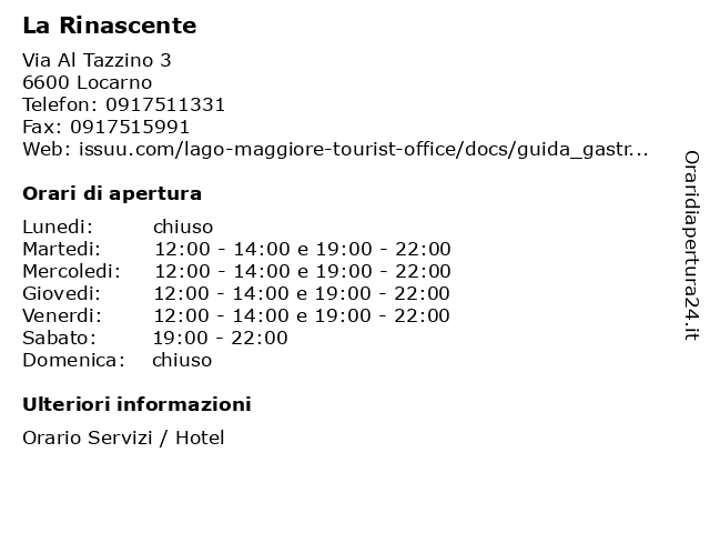 1 La Rinascente - Orario Ristorante (distanza: 0,00 km) Via Al Tazzino 3, 6600 Locarno la, orario, rinascente, ristorante, servizi, struttura ricettiva, turismo 2 Collinetta (distanza: 2,51 km) Strada Collinetta 15, 6612 Ascona collinetta, servizi, struttura ricettiva, turismo 3 Casa Berno (distanza: 4,10 km) Via G. Madonna 15, 6612 Ascona berno, casa, servizi, struttura ricettiva, turismo 4 Casa Berno - Orario Ristorante (distanza: 4,10 km) Via G. Madonna 15, 6612 Ascona berno, casa, orario, ristorante, servizi, struttura ricettiva, turismo 5 Bed & Breakfast Luce del Mattino (distanza: 25,95 km) Via Cavour 5, 28857 Santa Maria Maggiore agriturismo, albergo, b&b, bed, bed & breakfast, breakfast, del, dove alloggiare, luce, mattino, ristorante, ristorazione, struttura ricettiva, vacanze, villeggiatura 6 Bed & Breakfast Piccolo Mondo (distanza: 28,16 km) via del Gabbio 3, 28853 Druogno agriturismo, albergo, b&b, bed, bed & breakfast, breakfast, dove alloggiare, mondo, piccolo, ristorante, ristorazione, struttura ricettiva, vacanze, villeggiatura |