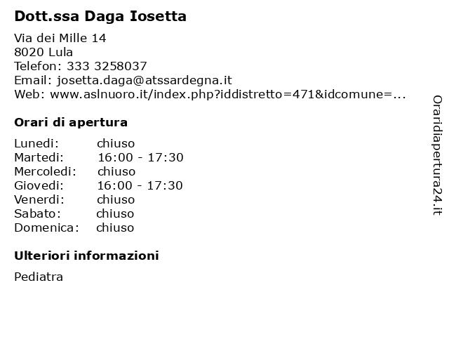 1 Dott.ssa Daga Iosetta (distanza: 8,82 km) Via Fiume 5, 08021 Bitti ambulatorio, daga, dott.ssa, dottore, impegnative, iosetta, medico, prescrizione farmaci, ricette, visite 2 Dott.ssa Daga Iosetta (distanza: 11,99 km) Piazza Satta snc, 08020 Orune ambulatorio, daga, dott.ssa, dottore, impegnative, iosetta, medico, prescrizione farmaci, ricette, visite 4 Dott.ssa Disi Lucia (distanza: 20,34 km) Via Sebastiano Satta 101, 08028 Orosei ambulatorio, disi, dott.ssa, dottore, impegnative, lucia, medico, prescrizione farmaci, ricette, visite 5 Dott. Salis Antonello (distanza: 20,39 km) Via Cedrino 9, 08029 Siniscola ambulatorio, antonello, dott., dottore, impegnative, medico, prescrizione farmaci, ricette, salis, visite 6 Dott.ssa Pau Anna Grazia (distanza: 20,52 km) Via Cedrino 1, 08029 Siniscola ambulatorio, anna, dott.ssa, dottore, grazia, impegnative, medico, pau, prescrizione farmaci, ricette, visite |
