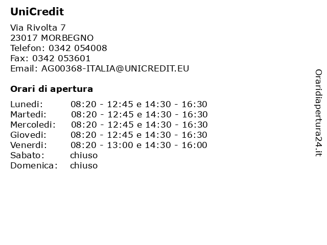 2 Unicredit (Bancomat) (distanza: 0,06 km) Via Rivolta 7, 23017 Morbegno (bancomat), orari bancomat unicredit, unicredit, unicredit bancomat 3 Unicredit (Bancomat) (distanza: 14,88 km) Via Nazionale 70, 23823 Colico (bancomat), orari bancomat unicredit, unicredit, unicredit bancomat 4 Unicredit (Bancomat) (distanza: 45,85 km) Via Provinciale 34, 24022 Alzano Lombardo (bancomat), orari bancomat unicredit, unicredit, unicredit bancomat 5 Unicredit (Bancomat) (distanza: 47,14 km) Via Ruggeri Pietro da Stabello 10 -12, 24123 Bergamo (bancomat), orari bancomat unicredit, unicredit, unicredit bancomat 6 Unicredit (Bancomat - Fronte Strada) (distanza: 47,57 km) Piazza Vittorio Veneto 11, 24036 Ponte San Pietro (BG) (bancomat, bancomat unicredit, fronte, strada), unicredit, unicredit bancomat |