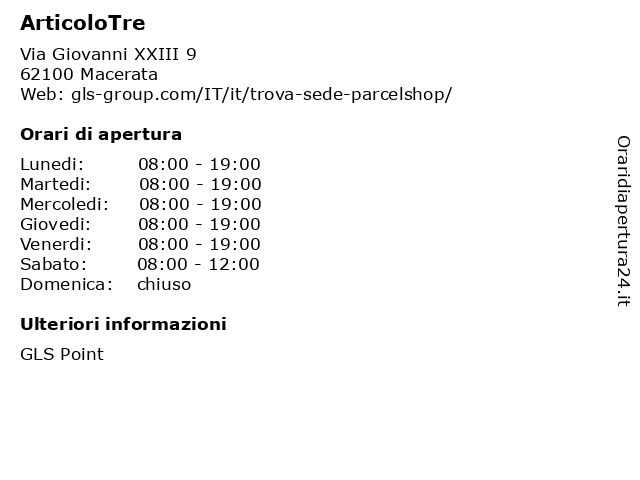 1 Tabaccheria (distanza: 4,23 km) Via Urbino 4, 62100 Macerata gls, negozio, shop, spedizione, tabaccheria 2 Bar Due Fonti (distanza: 4,97 km) Via Due Fonti 8/10, 62100 Macerata bar, due, fonti, gls, negozio, shop, spedizione 3 Centro Servizi 24 (distanza: 6,53 km) Via Sant' Anna 33, 62014 Corridonia 24, centro, gls, negozio, servizi, shop, spedizione 4 GLS Point (distanza: 17,74 km) Via Sandro Pertini Snc, 63812 Montegranaro gls, negozio, point, shop, spedizione 6 |