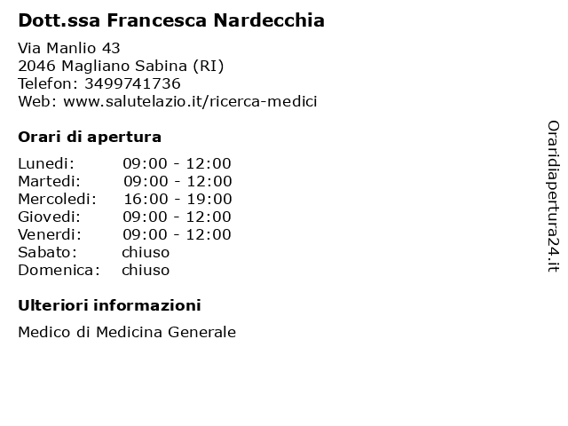 1 Nardecchia Ivano (distanza: 48,59 km) Via Ferrante Ruiz 25, 00168 Roma automobili, ivano, nardecchia, nuove, rivend, usate 2 Nardecchia (distanza: 51,86 km) Via Monserrato 106, 00186 Roma antichita, libri, nardecchia, stampe, vintage 3 La Vineria Di Nardecchia Ottaviano Massimo (distanza: 55,42 km) Via Quinto Novio 35, 00175 Roma bottiglierie, massimo, nardecchia, ottaviano, superalcolici, vineria, vini 4 Fotolandia By Mariano (distanza: 56,18 km) Via Delle Rondini 77/a b, 00169 Roma articoli, comm, dett, fotolandia, mariano, nardecchia, vari 5 Dott.ssa Anna Dmitrieva (distanza: 0,00 km) Via Manlio 43, 02046 Magliano Sabina ambulatorio, anna, cura della persona, dmitrieva, dott.ssa, medicina, medico, prevenzione, salute 6 Dr. Granati Fabrizio (distanza: 0,09 km) Via della Repubblica 28, 02046 Magliano Sabina (RI) ambulatori, circoscrizione, dottore, dr., fabrizio, granati, guarigione, medico di base, medico di famiglia, pediatra, studi, visita |