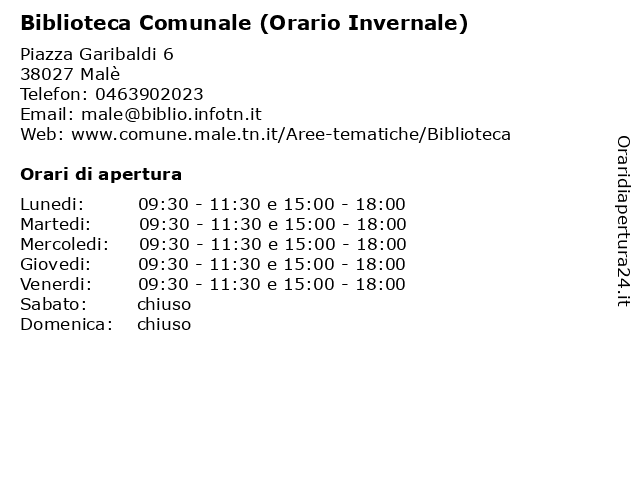 1 Biblioteca Comunale (Orario Invernale) (distanza: 4,26 km) Piazza Madonna della Pace 12, 38025 Dimaro (TN) (orario, biblioteca, biblioteca comunale, biblioteche, catalogazione, catalogo topografico, comunale, gruppo studio, indicizzazione, inventario, invernale), letteratura, libri, moderni, opuscoli, patrimonio librario, servizi 2 Biblioteca Comunale (Orario Luglio Agosto) (distanza: 0,00 km) Piazza Garibaldi 6, 38027 Malè (orario, agosto), biblioteca, comunale, cultura, luglio, malè, orari 3 Museo della Civiltà Solandra (orario 15 giugno - 15 settembre) (distanza: 0,00 km) Piazza Garibaldi 6, 38027 Malè (orario, 15, archeologia, archivi, beni culturali, cataloghi, cattedrali, chiese, civiltà, cultura, della, galleria, giugno, monumenti, musei, museo, opere, orario, settembre, solandra 4 Biblioteca comunale (distanza: 0,26 km) Piazza Regina Elena 27, 38027 Malè (TN) accesso, anagrafe, antichi, arte, autore, biblioteca, biblioteca comunale, biblioteche, catalogazione, catalogo topografico, comunale, gruppo studio, indicizzazione, inventario, letteratura, libri, moderni, opuscoli, patrimonio librario, servizi 5 ENI STATION (orario invernale) (distanza: 0,27 km) S.s.42 Del Tonale Via Nazionale SNC, 38027 Malè (TN) (orario, a secco, auto, benzina, blu diesel, carburanti, di, diesel, energia, eni, invernale, invernale), lubrificanti, orario, pompa di benzina, rifornimento, servizio, soccorso, station, stazioni 6 MD Discount (Orario Invernale) (distanza: 0,88 km) Via Nazionale 81, 38027 Terzolas (orario, discount, invernale), md, negozio, supermercato |