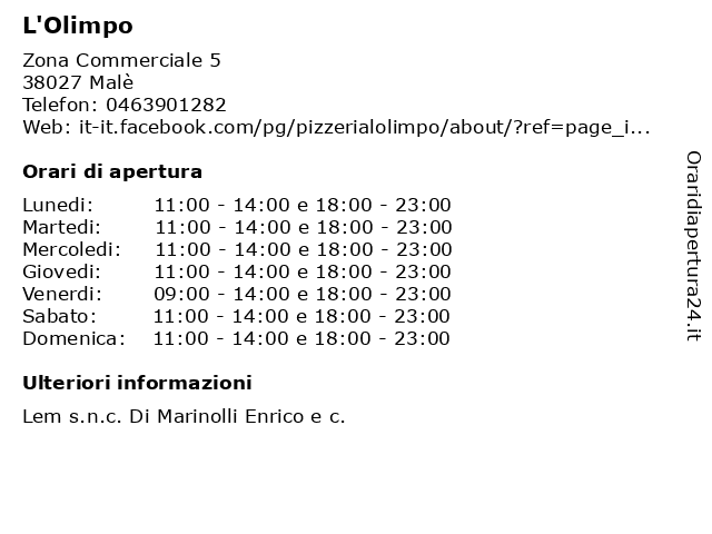 | Mercoledi | 11:00-14:00 e 18:00-23:00 |