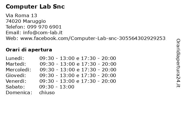 | Lunedi | 09:30-13:00 e 17:30-20:00 |