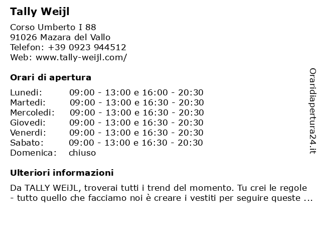1 Tally Weijl (distanza: 19,51 km) Via Caduti di Nassirya snc, 91022 Castelvetrano abbigliamento, denim, jeans, moda, prêt à porter, stile, tally, tally weijl, trend, vestiti, vestiti femminili, weijl 2 Tally Weijl (distanza: 19,64 km) Via Caduti di Nassirya s.n.c., 91022 Castelvetrano (TP) abbigliamento, accessori, fashion, moda, tally, vestiti, weijl 3 Pimkie (distanza: 0,05 km) Via Umberto I snc, 91026 Mazara del Vallo moda, pimkie, stile, tessuto, trend 6 Carrera Store Campobello (distanza: 13,97 km) Via Vittorio Emanuele II 3172, 91021 Campobello di Mazara campobello, carrera, casual, jeans, sportswear, store |