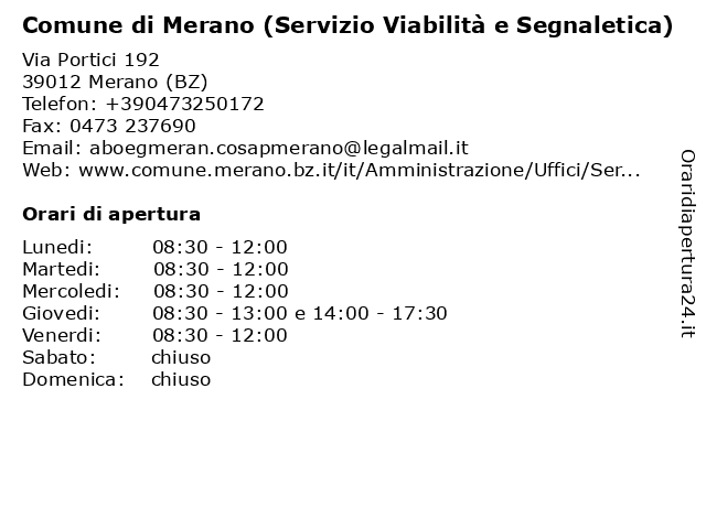 1 Centrale Viabilità Provinciale (distanza: 23,08 km) Viale Druso 116, 39100 Bolzano centrale, centrale viabilità, informazioni aggiornate sulla situazione del traffico, provinciale, sui cantieri stradali e sulle vie di montagna, traffico, viabilità 2 Polizia Municipale - Nucleo Viabilità (distanza: 24,59 km) via G.Galilei 23, 39100 Bolzano comune, municipale, nucleo, polizia, servizi, viabilità 3 Mott Segnaletica Stradale (distanza: 28,44 km) Via Adriano Olivetti 4, 39055 Laives mott, segnaletica, stradale 4 Comune di Ora (Gabalin Elmar - Competenze: Commercio, artigianato ed industria -Viabilità e trasporto- Cantiere comunale) (distanza: 37,50 km) Piazza Principale 5, 39040 Ora BZ (gabalin, artigianato, cantiere, commercio, competenze, comunale), comune, di, ed, elmar, industria, ora, ora comune, trasporto, uffici comunali di ora, viabilità 5 Comune di Rabbi (Ufficio Viabilità e Cantieri Comunali) (distanza: 38,58 km) Frazione San Bernardo 48/D, 38020 Rabbi (ufficio, cantieri, cantieri comunali, comunali), comune, di, rabbi, servizi comunali, uffici comunali, viabilità 6 Vigilanza Urbana, Viabilità e controllo del territorio (Ufficio Polizia Locale) (distanza: 50,28 km) Piaz de Sotegrava 23, 38035 Moena (ufficio, amministrazione, amministrazione trasparente, assessore, comunale, comune, controllo, del, giunta comunale, locale), polizia, pratiche comunali, sindaco, sportello, territorio, ufficio comunale, urbana, viabilità, vigilanza |