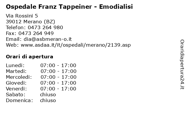1 Ospedale Franz Tappeiner - Banca di Trento e Bolzano • Sportello (distanza: 0,00 km) Via Rossini 5, 39012 Merano (BZ) ambulatorio, assistenza, banca, bolzano, cure mediche, di, franz, ospedale, sanità, servizi ai cittadini, sportello, tappeiner, trento 2 Ospedale Franz Tappeiner - Banca di Trento e Bolzano • Selfbanking (distanza: 0,00 km) Via Rossini 5, 39012 Merano (BZ) ambulatorio, assistenza, banca, bolzano, cure mediche, di, franz, ospedale, sanità, selfbanking, servizi ai cittadini, tappeiner, trento 3 Ospedale Franz Tappeiner - Visita ai Degenti (distanza: 0,00 km) Via Rossini 5, 39012 Merano (BZ) ai, ambulatorio, assistenza, cure mediche, degenti, franz, ospedale, sanità, servizi ai cittadini, tappeiner, visita 4 Ospedale Franz Tappeiner - Direzione Medica • Segreteria (distanza: 0,00 km) Via Rossini 5, 39012 Merano (BZ) ambulatorio, assistenza, cure mediche, direzione, franz, medica, ospedale, sanità, segreteria, servizi ai cittadini, tappeiner 5 Ospedale Franz Tappeiner - Ufficio Cartelle Mediche e Certicati di Nascita (distanza: 0,00 km) Via Rossini 5, 39012 Merano (BZ) ambulatorio, assistenza, cartelle, certicati, cure mediche, di, franz, mediche, nascita, ospedale, sanità, servizi ai cittadini, tappeiner, ufficio 6 Ospedale Franz Tappeiner - Servizio Sociale (distanza: 0,00 km) Via Rossini 5, 39012 Merano (BZ) ambulatorio, assistenza, cure mediche, franz, ospedale, sanità, servizi ai cittadini, servizio, sociale, tappeiner |