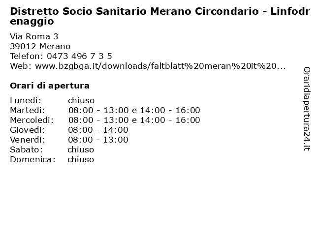 1 Merano Circondario (Sportello unico per l'assistenza e cura Distretto Socio Sanitario di Merano) (distanza: 0,00 km) Via Roma 3, 39012 Merano (sportello, circondario, cura, di, distretto, informazione, l'assistenza, merano, merano), per, sanitario, servizi, socio, unico 2 Distretto Socio Sanitario Merano Circondario - Segreteria (distanza: 0,00 km) Via Roma 3, 39012 Merano ambulatorio, assistenza, circondario, cure mediche, distretto, merano, sanitario, sanità, segreteria, servizi ai cittadini, socio 3 Distretto Socio Sanitario Merano Circondario - Assistenza Domiciliare (distanza: 0,00 km) Via Roma 3, 39012 Merano ambulatorio, assistenza, circondario, cure mediche, distretto, domiciliare, merano, sanitario, sanità, servizi ai cittadini, socio 4 Distretto Socio Sanitario Merano Circondario - Consultorio Ostetrico (distanza: 0,00 km) Via Roma 3, 39012 Merano ambulatorio, assistenza, circondario, consultorio, cure mediche, distretto, merano, ostetrico, sanitario, sanità, servizi ai cittadini, socio 5 Distretto sanitario Val Passiria (Servizio Amministrativo) (distanza: 7,38 km) Via Passiria 3, 39015 San Leonardo in Passiria (servizio, amministrativo), distretto, informazione, passiria, sanitario, servizi, val 6 Distretto sanitario Val Passiria (Servizio Infermieristico) (distanza: 7,38 km) Via Passiria 3, 39015 San Leonardo in Passiria (servizio, distretto, infermieristico), informazione, passiria, sanitario, servizi, val |
