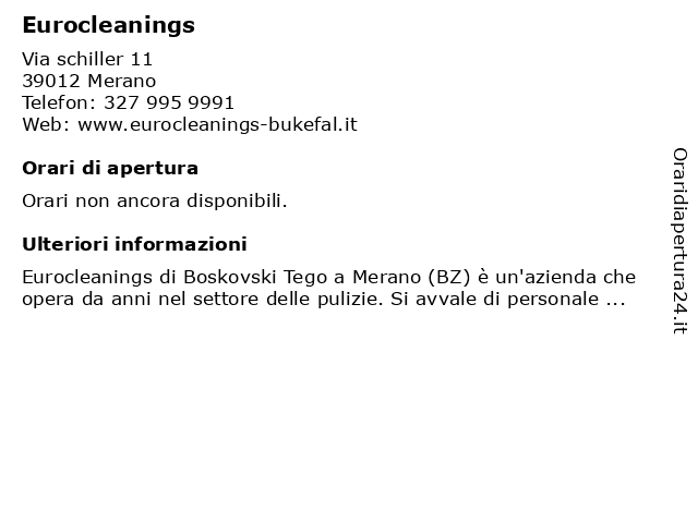 1 Impresa Di Pulizie Eurocleanings S.n.c. (distanza: 1,34 km) Via Laurin 36/b, 39012 Merano eurocleanings, impresa, pulizie |