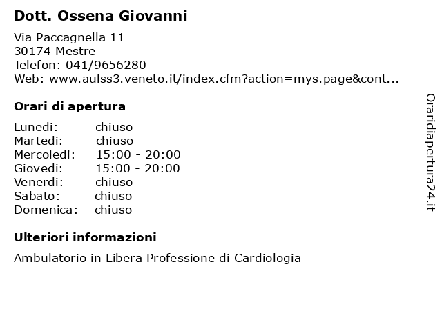 1 Ossena Riccardo (distanza: 11,62 km) Sestiere San Polo 1028, 30125 Venezia agenti, assicuraz, ossena, riccardo, serv 2 Avvocato Ossena Valentino (distanza: 11,69 km) Cannaregio 5783, 30121 Venezia (VE) appuntamenti, avvocati, avvocato, difensori, leggi, ossena, valentino 3 Dott. Pozzan Giovanni Battista (distanza: 0,00 km) Via Paccagnella 11, 30174 Mestre ambulatorio, assistenza, battista, cure mediche, dott., giovanni, pozzan, sanità, servizi ai cittadini 4 Avvocato Boldon Zanetti Giovanni (distanza: 0,15 km) Via Gabriel Bella 3, 30174 Venezia -Mestre (VE) appuntamenti, avvocati, avvocato, boldon, difensori, giovanni, leggi, zanetti 5 Centro di Medicina (Dott.ssa Maria Valentina Di Giovanni) (distanza: 0,30 km) Via Nilde Iotti 4, 30172 Venezia (dott.ssa, centro, giovanni), laboratorio, maria, medici, medicina, ospedale, poliambulatorio, prelievi, salute, valentina 6 Giovanni Bona Clinica Dentale (distanza: 0,53 km) Via Peppino Impastato 20, 30174 Mestre bona, clinica, dentale, dentisti mestre, giovanni, odontoiatri mestre |