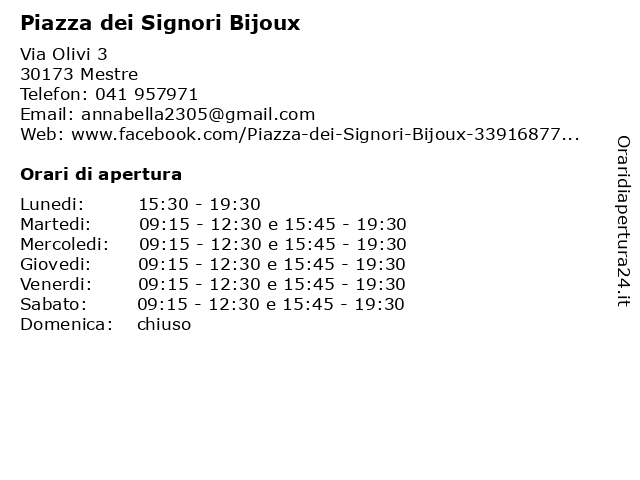 1 Piazza Dei Signori Bijoux Di Anna Del Sorbo (distanza: 0,02 km) Via Antonio Olivi 3, 30172 Venezia anna, articoli, bijoux, comm, dett, signori, sorbo, vari 2 Darma Bijoux Srl (distanza: 9,04 km) Sestiere Dorsoduro 2760, 30123 Venezia articoli, bijoux, comm, darma, dett, vari 3 Bijoux (distanza: 9,21 km) Sestiere Dorsoduro 1485/a, 30123 Venezia abbigl, bijoux, comm, dett, genere, giovanni, sartor 4 Az Bijoux (distanza: 9,47 km) Fondamenta Venier 3, 30141 Murano argenteria, az, bijoux, bracciali, collane, gioielleria, idee regalo, oreficeria, orologi 5 Isola Bijoux (distanza: 9,52 km) Fondamenta Dei Vetrai 10-14, 30141 Venezia articoli, bijoux, center, comm, dett, isola, murano, vari 6 Corina Bijoux Di Mamaliga Corina (distanza: 9,58 km) Sestiere San Marco 672/673, 30124 Venezia abbigl, bijoux, comm, corina, dett, genere, mamaliga |