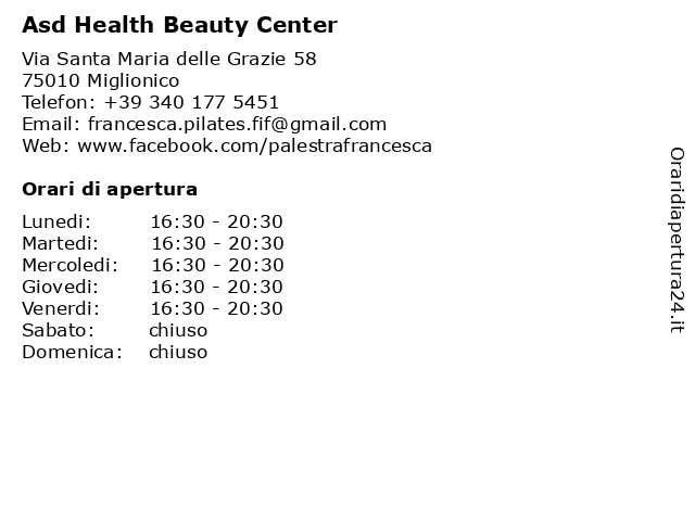 1 ASD Motoria e Wellness (distanza: 0,28 km) Via Appia 46, 75010 Miglionico, Basilicata asd, motoria, palestra, salute, sport, wellness 2 ASD Cavalieri della Santa Croce (distanza: 9,36 km) Via Fanti 2, 75013 Ferrandina asd, azienda, cavalieri, cliente, croce, della, fabbrica, santa, vendita 3 Asd A Passo di Danza (distanza: 10,56 km) Via Nazionale 46, 75010 Grottole allenatore, asd, balletto, danza, di, musica, passo, pista da ballo 4 ASD Centro Equilibrio (distanza: 13,14 km) Via Bradano 31, 75100 Matera asd, centro, equilibrio, nuoto 5 ASD Neos Matera (distanza: 13,36 km) Via La Martella 44, 75100 Matera asd, atletica, fidal, matera, neos 6 FIPSAS Asd Sez. Prov. Matera (distanza: 13,53 km) Viale Italia 94B, 75100 Matera a.s.d., asd, associazione, fipsas, mare, matera, pesca, prov., sez., sport |