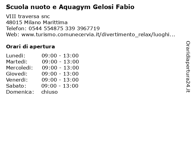 1 Piscina comunale di Cervian nuoto libero (orario estivo) (distanza: 5,25 km) Piazzale Val d'Isere 1, 48015 Pinarella di Cervia - Ravenna (orario, centro fitness, cervia, cervian, comunale, di, estivo, estivo), libero, nuoto, palestre, piscina, piscine 2 Centro Natatorio (orario invernale nuoto libero) (distanza: 17,62 km) Via Falconieri 31, 48100 Ravenna (orario, centro, centro fitness, invernale, libero), natatorio, nuoto, palestre, piscine 3 Centro Natatorio (orario estivo nuoto libero) (distanza: 17,62 km) Via Falconieri 31, 48100 Ravenna (orario, centro, centro fitness, estivo, libero), natatorio, nuoto, palestre, piscine 4 Libertas Nuoto (distanza: 17,62 km) Via Falconieri 33, 48124 Ravenna (RA) condevire, forza, gym, libertas, nuoto, palestra 5 Centro Nuoto Gianni Gambi 'Piscina Comunale' (distanza: 17,65 km) Via Chiarissimo Falconieri 31, 48124 Ravenna (RA) 'piscina, centro, comunale, comunale', condevire, forza, gambi, gianni, gym, nuoto, palestra, piscina 6 Cre estivi... a tutto sport - Libertas nuoto Ravenna - 2016 (distanza: 17,83 km) Via Chiarisimo Falconiereri 29/31, 48011 Ravenna 2016, bambini, centro estivo, cre, estivi..., libertas, nuoto, ravenna, sport, tutto |