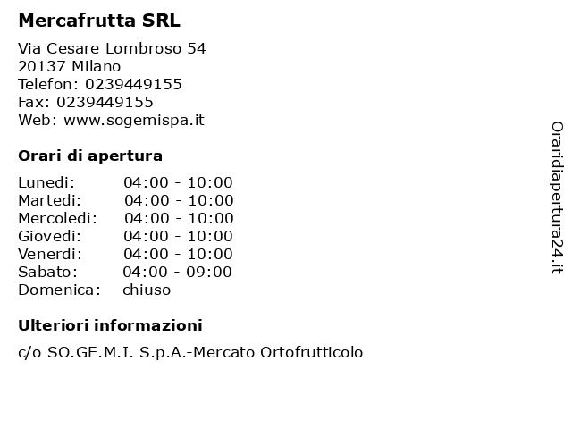 1 Mercafrutta (SO.GE.M.I. - Mercato Ortofrutticolo) (distanza: 0,00 km) Via Cesare Lombroso 54, 20137 Milano (so.ge.m.i., ingrosso, mercafrutta, mercato, ortofrutticolo), vendita 2 Mercafrutta (SO.GE.M.I. - Mercato Ortofrutticolo) (distanza: 0,00 km) Via Cesare Lombroso 54, 20137 Milano (so.ge.m.i., ingrosso, mercafrutta, mercato, ortofrutticolo), vendita 3 Mercafrutta Di Maddalena Giacinto e c. Sas (distanza: 7,60 km) Piazza Prealpi, 20155 Milano comm, dett, frutta, giacinto, maddalena, mercafrutta, verdura 4 Acri S.R.L. (distanza: 0,00 km) Via Cesare Lombroso 54, 20137 Milano acri, ingrosso, mercato ortofuticolo, s.r.l. 5 AG.RE. Agricola Regiroli SRL (distanza: 0,00 km) Via Cesare Lombroso 54, 20137 Milano ag.re., agricola, ingrosso, mercato ortofuticolo, regiroli, srl 6 Anton Import Export SRL (distanza: 0,00 km) Via Cesare Lombroso 54, 20137 Milano anton, export, import, ingrosso, mercato ortofuticolo, srl |