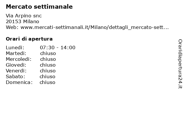 1 Mercato Settimanale (distanza: 0,00 km) Via Arcangeli snc, 20153 Milano mercati, mercato, mercato all'apero, mercato all'aperto comune, mercato comunale, settimanale, vendita all'aperto 2 Mercato Settimanale (distanza: 0,00 km) Via Arioli Venegoni snc, 20153 Milano mercati, mercato, mercato all'apero, mercato all'aperto comune, mercato comunale, settimanale, vendita all'aperto 3 Mercato Settimanale (distanza: 0,00 km) via Arpino snc, 20153 Milano mercati, mercato, mercato all'apero, mercato all'aperto comune, mercato comunale, settimanale, vendita all'aperto 4 Mercato Settimanale (distanza: 2,83 km) Piazza Falcone snc, 20090 Cesano Boscone mercati, mercato, mercato all'apero, mercato all'aperto comune, mercato comunale, settimanale, vendita all'aperto 5 Mercato Settimanale (distanza: 4,14 km) Via Osoppo snc, 20148 Milano mercati, mercato, mercato all'apero, mercato all'aperto comune, mercato comunale, settimanale, vendita all'aperto 6 Mercato Settimanale (distanza: 4,14 km) Via Zamagna snc, 20148 Milano mercati, mercato, mercato all'apero, mercato all'aperto comune, mercato comunale, settimanale, vendita all'aperto |