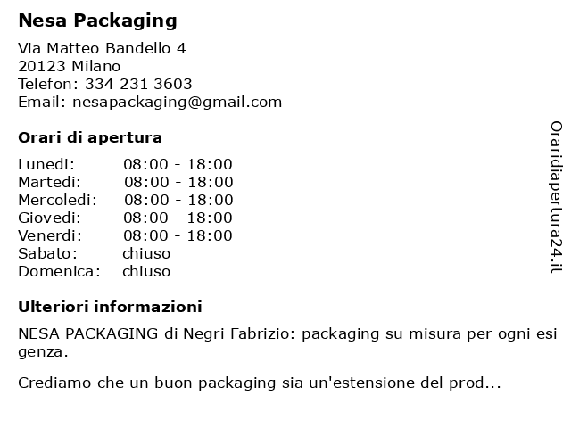 1 Packaging-Online.It (distanza: 0,92 km) Via Foro Bonaparte 59, 20121 Milano installatore, mobili, online.it, packaging, tende, tende da sole 2 Break Brand E Packaging Design (distanza: 1,09 km) Via ambrogio da fossano bergognone 7, 20144 Milano brand, break, design, packaging 3 Euro Packaging Italia S.r.l. (distanza: 1,58 km) Via Frua Giuseppe 24, 20146 Milano euro, italia, packaging 4 Simonetta Packaging (distanza: 4,42 km) Via Giuseppe Tartini 8, 20158 Milano alimentare., chimico, cosmetico, fornitura di packaging, packaging, settore farmaceutico, simonetta 5 Iraci packaging (distanza: 7,27 km) Via Vipacco 28, 20126 Milano iraci, packaging, servizi, utente varie 6 Orvem Packaging (distanza: 9,71 km) Via Danimarca 14/6, 20093 Cologno Monzese artigianalitŕ, aziende, italy, orvem, packaging, pasticcerie |
