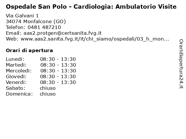 1 Ospedale San Polo - Cardiologia: Ambulatorio Pacemaker ed Aicd (distanza: 0,00 km) Via Galvani 1, 34074 Monfalcone (GO) aicd, ambulatorio, assistenza, cardiologia, cure mediche, ed, ospedale, pacemaker, polo, san, sanità, servizi ai cittadini 2 Ospedale San Polo - Cardiologia: Ambulatorio Riabilitazione Cardiologica (distanza: 0,00 km) Via Galvani 1, 34074 Monfalcone (GO) ambulatorio, assistenza, cardiologia, cardiologica, cure mediche, ospedale, polo, riabilitazione, san, sanità, servizi ai cittadini 3 Ospedale San Polo - Cardiologia: Ricevimento Direttore (distanza: 0,00 km) Via Galvani 1, 34074 Monfalcone (GO) ambulatorio, assistenza, cardiologia, cure mediche, direttore, ospedale, polo, ricevimento, san, sanità, servizi ai cittadini 4 Ospedale San Polo - Cardiologia: Ambulatorio Holter (distanza: 0,00 km) Via Galvani 1, 34074 Monfalcone (GO) ambulatorio, assistenza, cardiologia, cure mediche, holter, ospedale, polo, san, sanità, servizi ai cittadini 5 Ospedale San Polo - Cardiologia: Ricevimento Coordinatori Infermieristici (distanza: 0,00 km) Via Galvani 1, 34074 Monfalcone (GO) ambulatorio, assistenza, cardiologia, coordinatori, cure mediche, infermieristici, ospedale, polo, ricevimento, san, sanità, servizi ai cittadini 6 Ospedale San Polo - Cardiologia: Ricevimento Medici (distanza: 0,00 km) Via Galvani 1, 34074 Monfalcone (GO) ambulatorio, assistenza, cardiologia, cure mediche, medici, ospedale, polo, ricevimento, san, sanità, servizi ai cittadini |