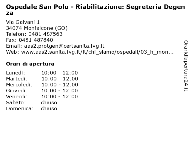 1 Ospedale San Polo - Pneumologia (distanza: 0,00 km) Via Galvani 1, 34074 Monfalcone ambulatorio, assistenza, cure mediche, ospedale, pneumologia, polo, san, sanità, servizi ai cittadini 2 Ospedale San Polo (Cardiotocografia antepartale) (distanza: 0,00 km) Via Galvani 1, 34074 Monfalcone (cardiotocografia, antepartale), medici, ospedale, polo, salute, san 3 Ospedale San Polo (Pianificazione familiare) (distanza: 0,00 km) Via Galvani 1, 34074 Monfalcone (pianificazione, familiare), medici, ospedale, polo, salute, san 4 Ospedale San Polo (Riabilitazione e rieducazione funzionale) (distanza: 0,00 km) Via Galvani 1, 34074 Monfalcone (riabilitazione, funzionale), medici, ospedale, polo, rieducazione, salute, san 5 Ospedale San Polo - Centro Diabetologico: Ambulatorio Piede Diabetico (distanza: 0,00 km) Via Galvani 1, 34074 Monfalcone (GO) ambulatorio, assistenza, centro, cure mediche, diabetico, diabetologico, ospedale, piede, polo, san, sanità, servizi ai cittadini 6 Ospedale San Polo - Chirurgia Generale: Ricevimento Medici (distanza: 0,00 km) Via Galvani 1, 34074 Monfalcone (GO) ambulatorio, assistenza, chirurgia, cure mediche, generale, medici, ospedale, polo, ricevimento, san, sanità, servizi ai cittadini |