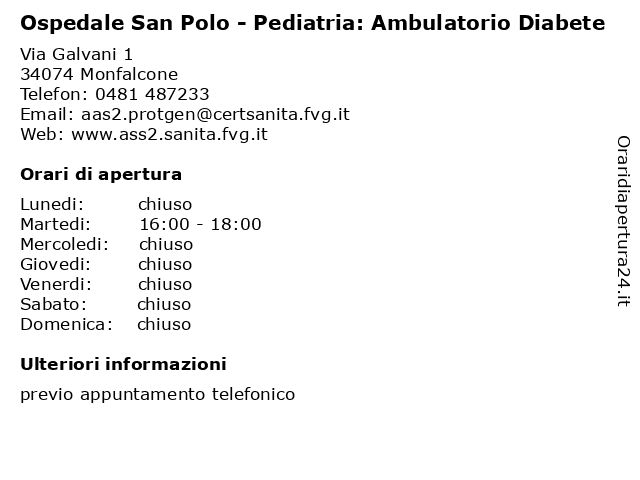1 Ospedale San Polo - Pneumologia (distanza: 0,00 km) Via Galvani 1, 34074 Monfalcone ambulatorio, assistenza, cure mediche, ospedale, pneumologia, polo, san, sanità, servizi ai cittadini 2 Ospedale San Polo (Cardiotocografia antepartale) (distanza: 0,00 km) Via Galvani 1, 34074 Monfalcone (cardiotocografia, antepartale), medici, ospedale, polo, salute, san 3 Ospedale San Polo (Pianificazione familiare) (distanza: 0,00 km) Via Galvani 1, 34074 Monfalcone (pianificazione, familiare), medici, ospedale, polo, salute, san 4 Ospedale San Polo (Riabilitazione e rieducazione funzionale) (distanza: 0,00 km) Via Galvani 1, 34074 Monfalcone (riabilitazione, funzionale), medici, ospedale, polo, rieducazione, salute, san 5 Ospedale San Polo - Centro Diabetologico: Ambulatorio Piede Diabetico (distanza: 0,00 km) Via Galvani 1, 34074 Monfalcone (GO) ambulatorio, assistenza, centro, cure mediche, diabetico, diabetologico, ospedale, piede, polo, san, sanità, servizi ai cittadini 6 Ospedale San Polo - Chirurgia Generale: Ricevimento Medici (distanza: 0,00 km) Via Galvani 1, 34074 Monfalcone (GO) ambulatorio, assistenza, chirurgia, cure mediche, generale, medici, ospedale, polo, ricevimento, san, sanità, servizi ai cittadini |