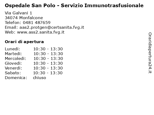 1 Ospedale San Polo - Servizio Immunotrasfusionale : Segreteria (distanza: 0,00 km) Via Galvani 1, 34074 Monfalcone ambulatorio, assistenza, cure mediche, immunotrasfusionale, ospedale, polo, san, sanità, segreteria, servizi ai cittadini, servizio 2 Ospedale - Servizio Immunotrasfusionale : Segreteria (distanza: 14,94 km) Viale Fatebenefratelli 34, 34170 Gorizia ambulatorio, assistenza, cure mediche, immunotrasfusionale, ospedale, sanità, segreteria, servizi ai cittadini, servizio 3 Ospedale - Servizio Immunotrasfusionale : Accesso donatori periodici (distanza: 14,94 km) Viale Fatebenefratelli 34, 34170 Gorizia accesso, ambulatorio, assistenza, cure mediche, donatori, immunotrasfusionale, ospedale, periodici, sanità, servizi ai cittadini, servizio 4 Ospedale - Servizio Immunotrasfusionale : Accesso candidati alla prima donazione (distanza: 14,94 km) Viale Fatebenefratelli 34, 34170 Gorizia accesso, alla, ambulatorio, assistenza, candidati, cure mediche, donazione, immunotrasfusionale, ospedale, prima, sanità, servizi ai cittadini, servizio 5 Ospedale - Servizio Immunotrasfusionale : Ambulatorio consulenza TAO terapia anticoagulante (distanza: 14,94 km) Viale Fatebenefratelli 34, 34170 Gorizia ambulatorio, anticoagulante, assistenza, consulenza, cure mediche, immunotrasfusionale, ospedale, sanità, servizi ai cittadini, servizio, tao, terapia 6 Ospedale - Servizio Immunotrasfusionale : Ambulatorio terapia trasfusionale (distanza: 14,94 km) Viale Fatebenefratelli 34, 34170 Gorizia ambulatorio, assistenza, cure mediche, immunotrasfusionale, ospedale, sanità, servizi ai cittadini, servizio, terapia, trasfusionale |