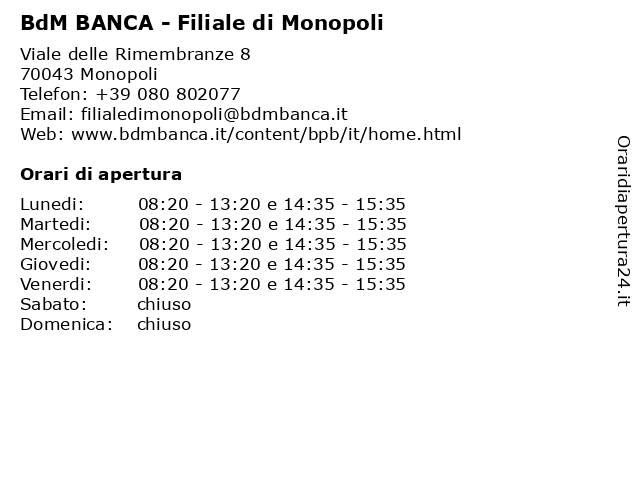 1 BdM BANCA - Filiale di Polignano (distanza: 7,51 km) Via R. Del Drago 1, 70044 Polignano a Mare banca, bdm, filiale, polignano 2 BdM Banca (distanza: 13,78 km) Piazza della Repubblica 10, 70013 Castellana Grotte banca, bdm, finanziamenti, prelievi, prestiti, versamenti 3 BdM BANCA - Filiale di Fasano (distanza: 14,20 km) Corso Vittorio Emanuele 5, 72015 Fasano banca, bdm, fasano, filiale 4 BdM BANCA - Filiale di Conversano (distanza: 15,00 km) Viale degli Eroi 2, 70014 Conversano banca, bdm, conversano, filiale 5 BdM BANCA - Filiale di Putignano (distanza: 18,55 km) Corso Umberto I 45, 70017 Putignano banca, bdm, filiale, putignano 6 BdM Banca (Bancomat) (distanza: 0,01 km) Viale delle Rimembranze 8, 70043 Monopoli (BA) (bancomat), atm, banca, bancomat, bari, bdm, contanti, conto corrente, di, popolare, prelievi, ricariche telefoniche, risparmi, versamenti |