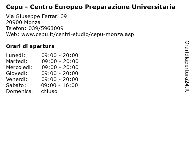 1 Cepu - Centro Europeo Preparazione Universitaria (distanza: 9,86 km) Via Bono Adelaide Cairoli 32, 20127 Milano centro, cepu, clienti, europeo, preparazione, qualità, servizi, universitaria 2 Cepu - Centro Europeo Preparazione Universitaria (distanza: 14,45 km) Corso Vittorio Emanuele II 15, 20122 Milano centro, cepu, esami, europeo, preparazione, recupero anni scolastici, studi, universitaria 3 Centro Stima Danni Europeo Snc Di Giorgetti Paolo e c. (distanza: 2,83 km) Via Puglia 15, 20900 Monza agenti, assicuraz, centro, danni, europeo, giorgetti, paolo, serv, stima 4 Fondazione MBBM - Corso di Preparazione al Parto (distanza: 3,52 km) via Pergolesi 33, 20052 Monza al, assistenza, corso, di, fondazione, mbbm, parto, preparazione, servizi 5 Cooperativa Universitaria Studio e Lavoro (distanza: 3,65 km) Via Cadore 48, 20900 Monza cooperativa, lavoro, libreria, libri, studio, universitaria 6 Istituto Europeo di Shiatsu (distanza: 9,29 km) Via Aristotele 39, 20128 Milano associazioni, di, europeo, fondazioni istituti, istituto, shiatsu |