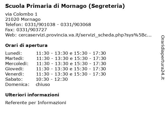 1 Scuola secondaria di 1° grado di Mornago (Segreteria) (distanza: 0,00 km) via Colombo 1, 21020 Mornago (segreteria), 1°, di, educazione, grado, istituto scolastico, istruzione, mornago, scuola, scuola secondaria, secondaria, statale 2 Scuola Primaria Giovanni Pascoli (Orario di funzionamento del plesso) (distanza: 0,00 km) Via Colombo 1, 21020 Mornago (VA) (orario, del, di, funzionamento, giovanni, istituto scolastico, pascoli, plesso), primaria, scuola 3 Scuola Secondaria di I° grado Mornago (Orario di funzionamento del plesso) (distanza: 0,00 km) Via Colombo 1, 21020 Mornago (VA) (orario, del, di, funzionamento, grado, istituto scolastico, i°, mornago, plesso), scuola, secondaria 4 Scuola Primaria G. Pascoli (distanza: 0,07 km) Via Colombo 1, 21020 Mornago asili, g., pascoli, primaria, scuola, scuole 5 Scuola Primaria C. Battisti (distanza: 0,07 km) Via Colombo 1, 21020 Mornago asili, battisti, c., primaria, scuola, scuole 6 Istituto Comprensivo di Mornago (Segreteria - Orario Periodo con attività didattica) (distanza: 0,13 km) Via Alessandro Volta 9, 21020 Mornago (VA) (segreteria, attività, comprensivo, con, di, didattica), istituto, istituto scolastico, mornago, orario, periodo, scuola |