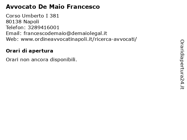 1 Avvocato De Maio Francesco (distanza: 5,27 km) Corso San Giovanni 1020, 80146 Napoli avvocato, de, forense, francesco, legale, maio, pratica, studio 2 Abbigliamento Manna Di De Maio Teresa (distanza: 0,88 km) Via Camillo Porzio 98/a, 80139 Napoli abbigl, abbigliamento, comm, dett, genere, maio, manna, teresa 3 De Maio Biagio (distanza: 1,02 km) Via Dei Tribunali 25, 80138 Napoli bar, biagio, birrerie, maio, paninoteche 5 De Maio Rosaria (distanza: 1,15 km) Vico Belvedere a Pignatelli 3, 80134 Napoli comm, dett, frutta, maio, rosaria, verdura 6 L'Oasi Sas Di Di Maio Salvatore (distanza: 1,22 km) Piazza Camillo Benso Conte Di Cavour, 80137 Napoli abbigl, comm, dett, genere, maio, oasi, salvatore |