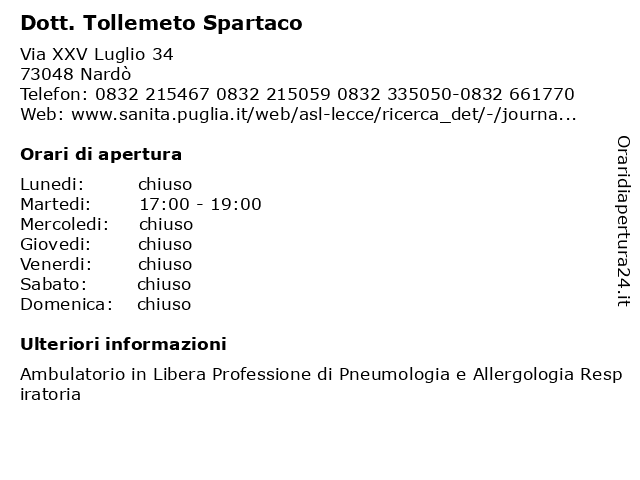 1 Poliambulatorio Nardō - Ambulatorio di Pneumologia : Dott. Spartaco Tollemeto (distanza: 0,24 km) Via XXV Luglio s.n.c., 73048 Nardō ambulatorio, di, dott., nardō, pneumologia, poliambulatorio, sanitā, servizi, spartaco, tollemeto 2 Mauro Spartaco e Figli Srl (distanza: 34,56 km) Via Vecchia Torchiarolo z.i., 72100 Brindisi comm, costruz, dett, figli, legname, mat, mauro, spartaco 3 Tollemeto Sergio (distanza: 51,66 km) Via Calabria 52, 72100 Brindisi geometri, sergio, studi tecnici, tollemeto |